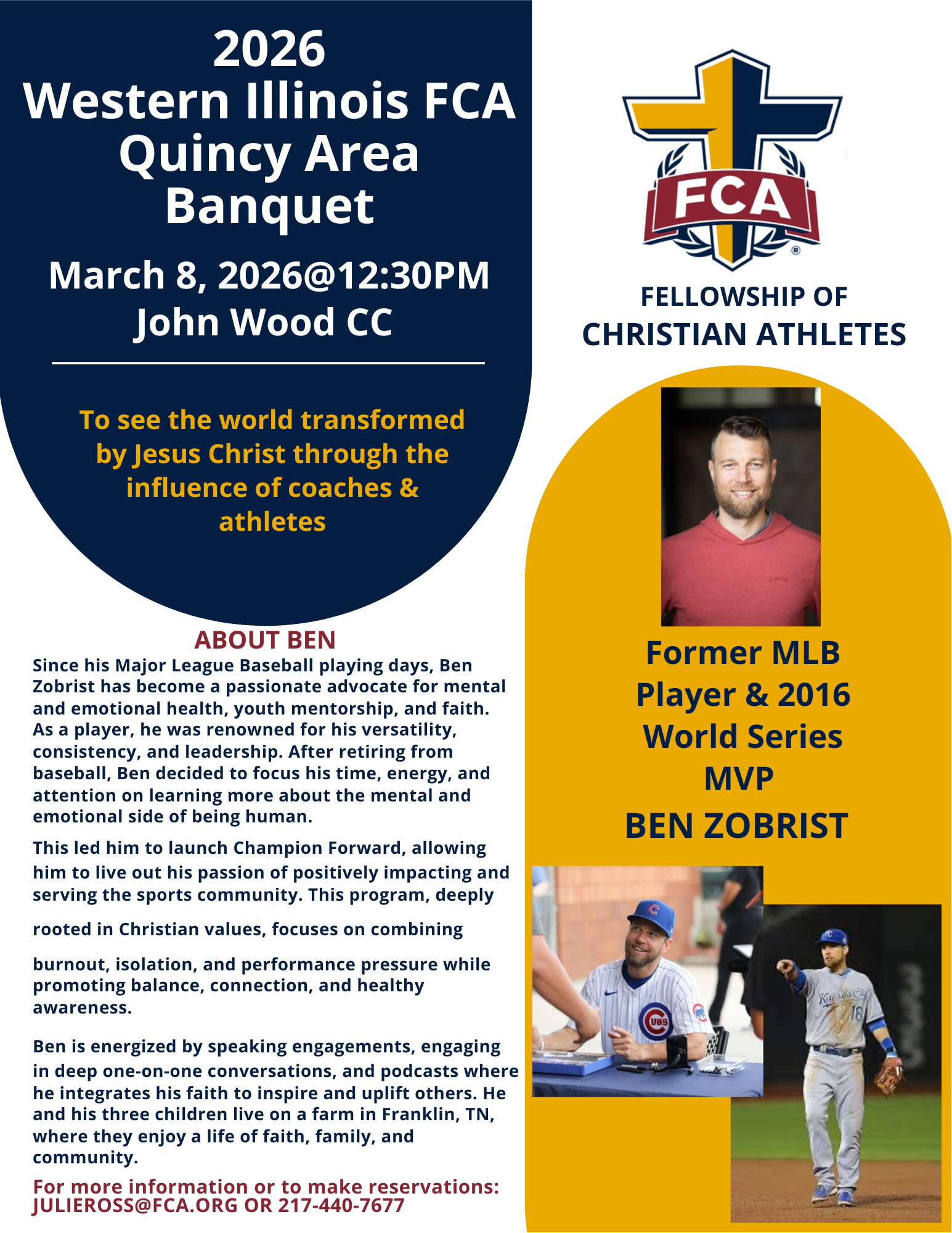 Each year, Western IL FCA hosts banquets in Quincy and Jacksonville to celebrate all the good work God is doing in our communities. We hear testimony from local coaches, parents and student athletes as they share how their relationship with God has grown through the ministry of FCA.